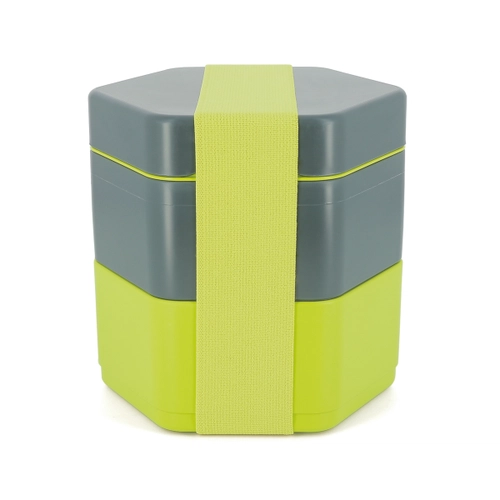 Bento à partir de fibres de canne à sucre. Composé de 2 parties de 500 ml, 1 compartiment couleur de 200 ml inséré à l'intérieur du compartimen gris. Fermée par un élastique.
