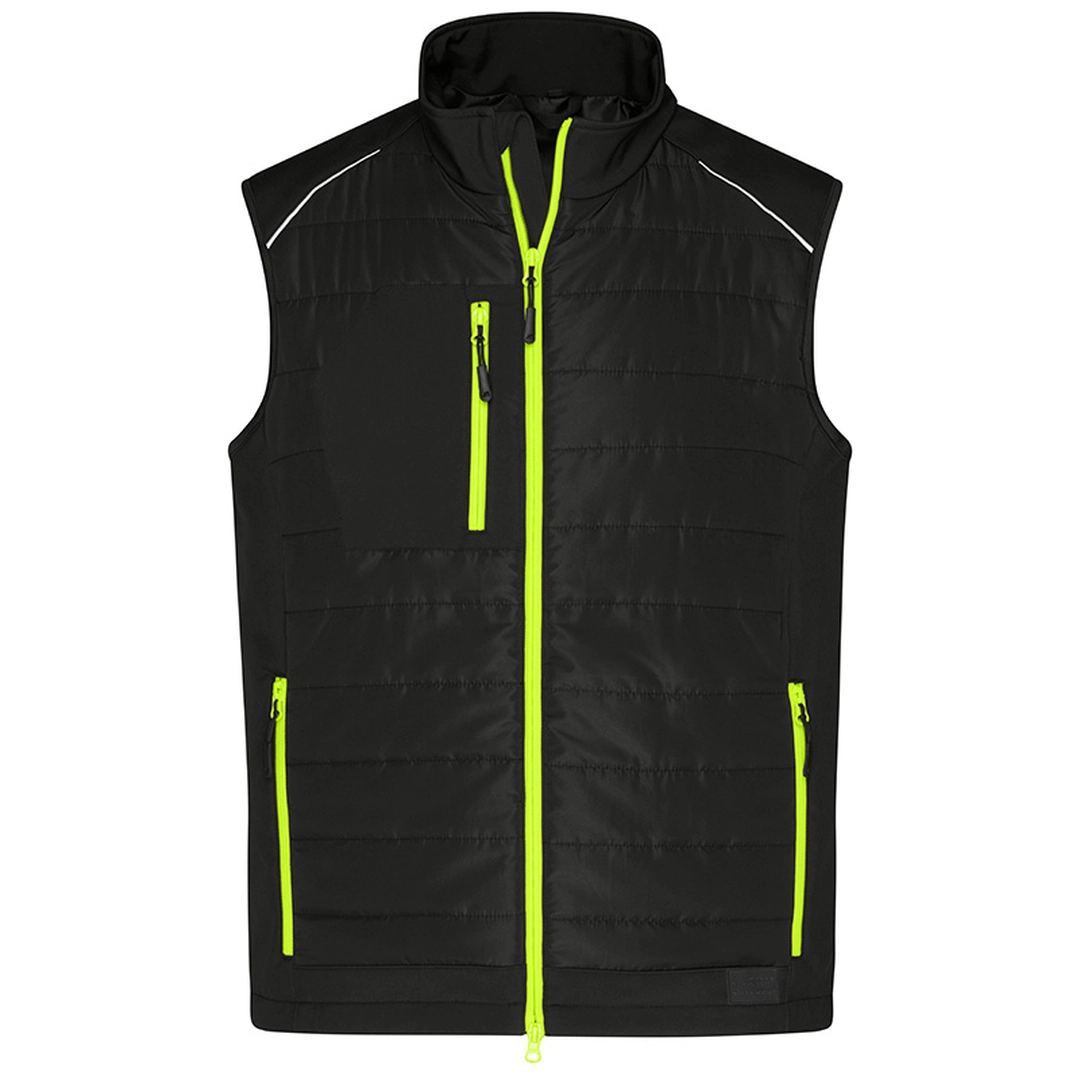 Ce bodywarmer "hybride" de la marque James & Nicholson impressionne par son tissu softshell à deux couches qui peut être porté aussi bien pour le travail que pour les loisirs.