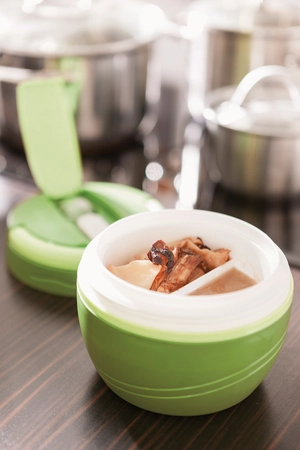 Boîte isotherme JOKO : intérieur amovible (utilisable au micro-ondes) avec 2 compartiments, poignée intégrée au couvercle vissable, compartiment avec fourchette-cuillère pliable. La boîte tient au chaud/ froid jusqu´à 4 heures, contenu env. 450 ml.