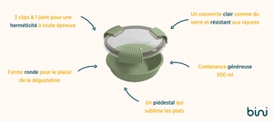 Matière principale:  Bol et clips bio sourcés : polymère en partie bio-sourcé réalisé à partir d'huiles recyclées de restaurants, Couvercle : Ecozen Durable et résiste aux rayures Aspect verre