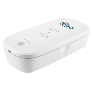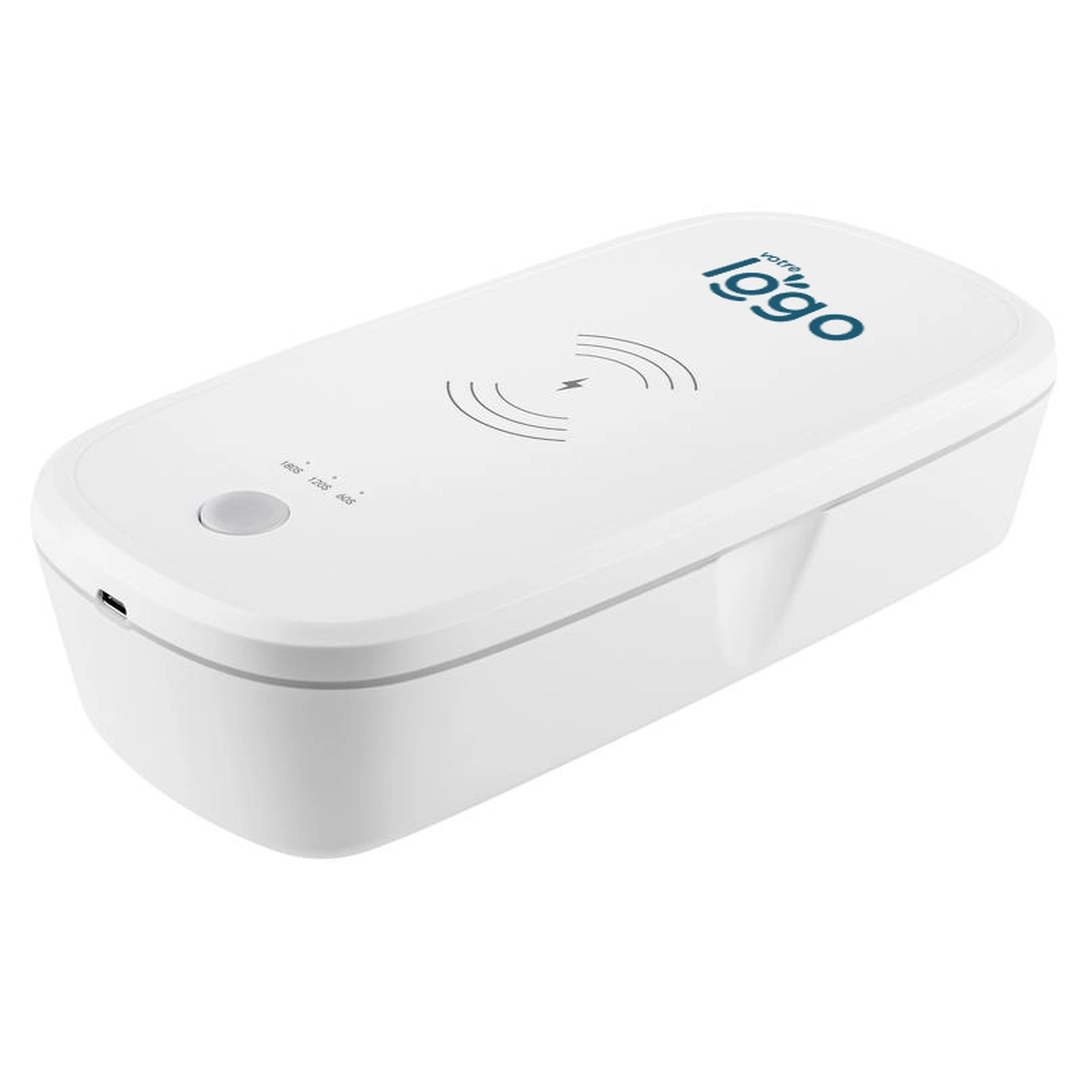 Vous souhaitez protéger vos collaborateurs ou clients contre les risques sanitaires ? Optez pour ce stérilisateur d'objets à UV personnalisable à votre logo. Le "Charge & Clean Station Pro UV" est une station à brancher sur une source d'alimentation pour profiter simultanément d'un chargeur à induction pour téléphone portable sur le couvercle du boîtier et d'un stérilisateur UV pour les petits objets.