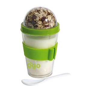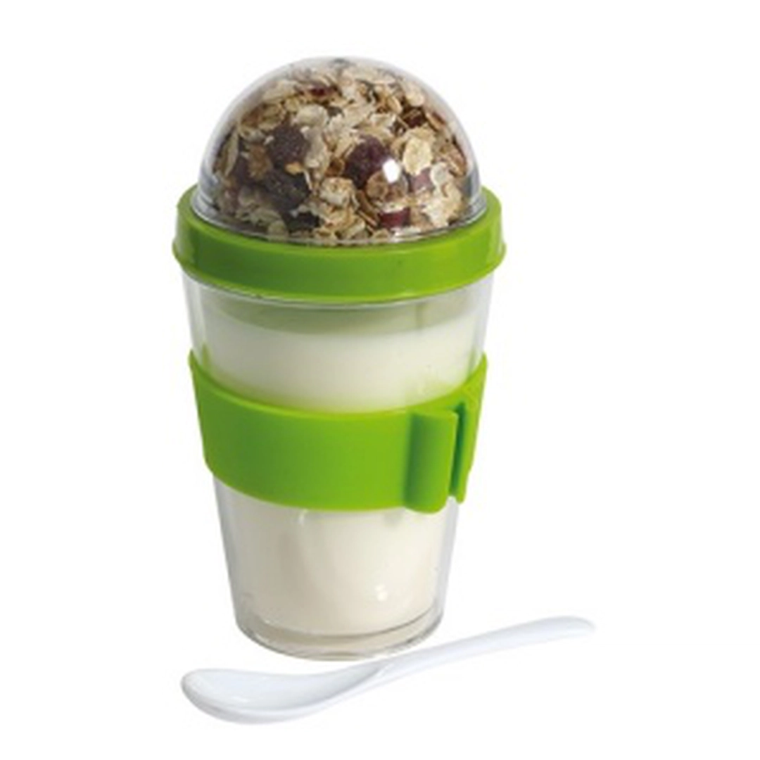 Bol à céréales CEREALS, double paroi : couvercle vissable pour remplir de céréales, bol transparent (contenance env. 350 ml) – idéal pour du yaourt – manchette en silicone avec passant pour la cuillère en plastique incluse.