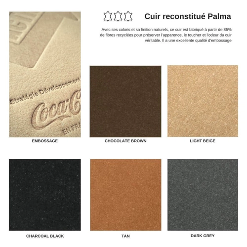 Cuir reconstitué Palma: Avec ses coloris et sa finition naturels, ce cuir est fabriqué à partir de 85% de fibres recyclées pour préserver l'apparence, le toucher et l'odeur du cuir véritable. Il a une excellente qualité de débossage.
