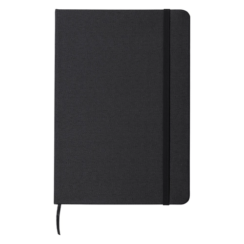 Carnet de note recouvert de polyester RPET avec 80 feuilles lignées, signet et sangle en caoutchouc. Format A5.