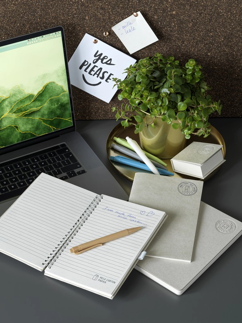 Carnet de notes au format A5 avec 30 feuilles lignées de 80 g/m², fabriquées à partir de briques de lait recyclées (jusqu'à 70 %).
