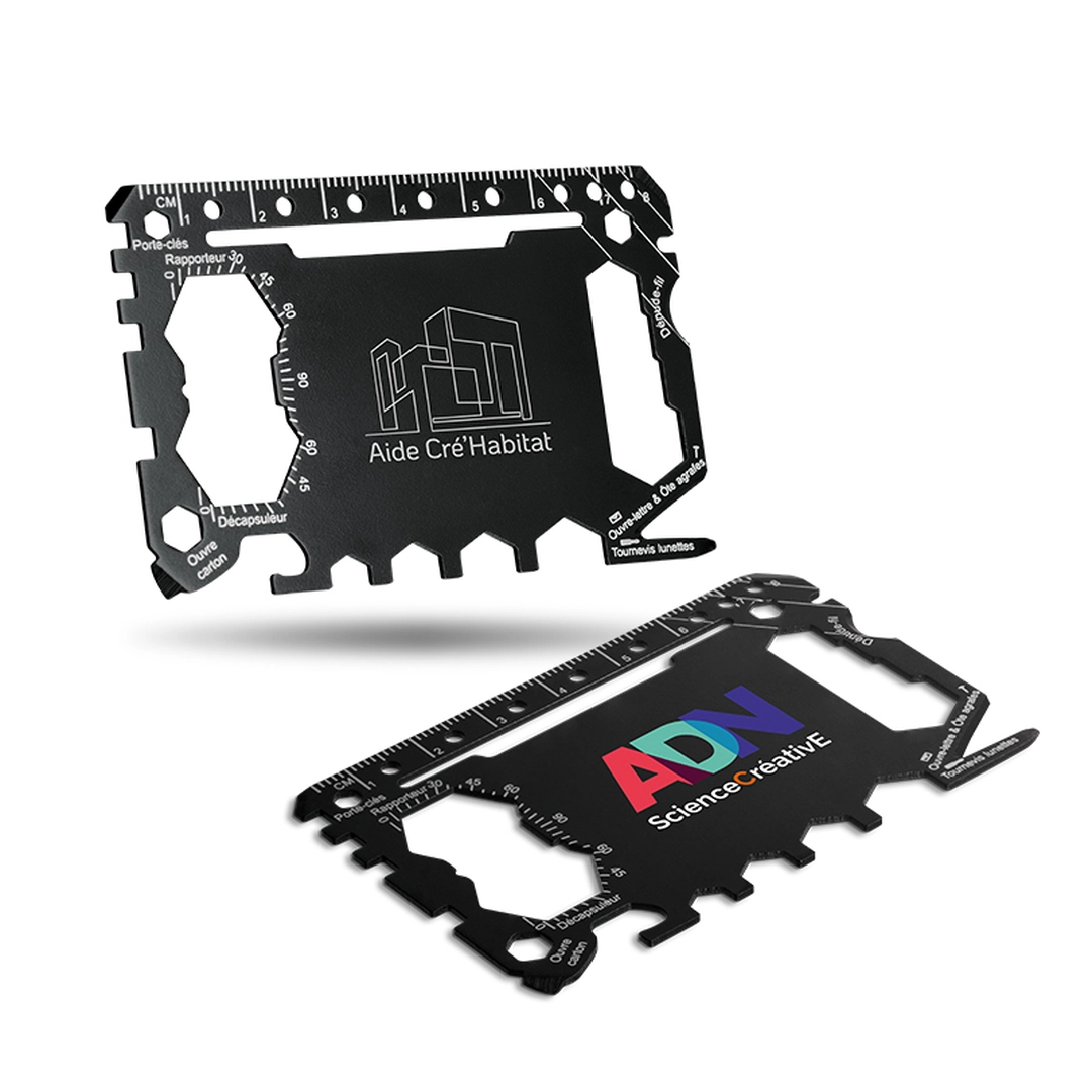 Offrez un outil aussi compact qu’ingénieux avec cette carte multifonction personnalisable en acier inoxydable. De la taille d’une carte de crédit, elle tient dans un portefeuille et offre 46 fonctions utiles pour les petits dépannages du quotidien.