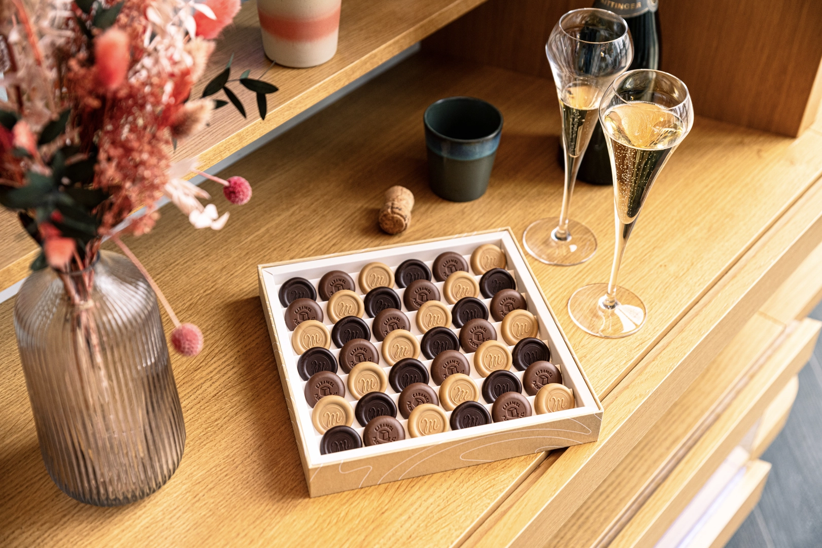 Offrez à vos clients une délicieuse sélection de chocolats, personnalisée avec le nom de votre société ou votre hôtel, pour une expérience de