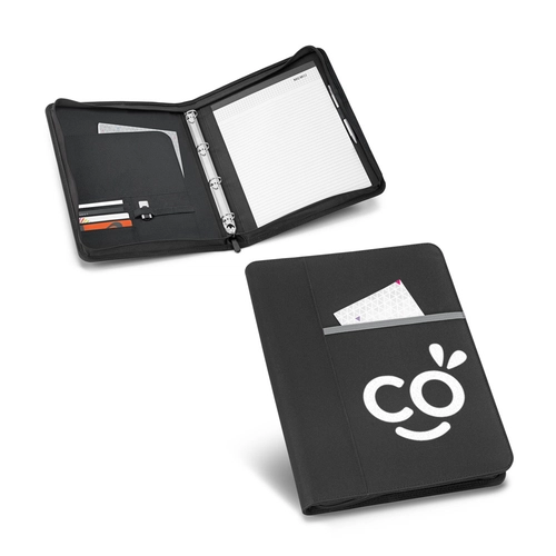 Le conférencier publicitaire A4 est un porte-documents personnalisé généralement équipé de post-it, stylos, pochettes… Pour le modèle suivant, à l’extérieur, vous trouverez une pochette très pratique pour y glisser des documents sans avoir à ouvrir le conférencier personnalisé. A l’intérieur, 4 anneaux de 20 mm qui permettront aux utilisateurs d’avoir sur eux, un classeur de conférence. Vous y trouverez également un bloc de 20 feuilles lignées, un support pour stylo et des compartiments de rangement, pour différents documents, cartes... Ce conférencier personnalisé à l’avantage non négligeable, de réellement se fermer, grâce à une fermeture éclair.