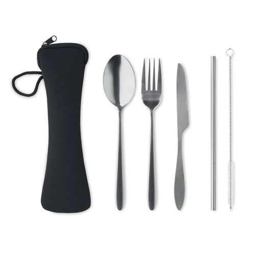 Ensemble de couverts réutilisables en acier inoxydable que vous pouvez facilement emporter partout et qui sont parfaits pour apporter votre déjeuner au travail. Ce set comprend une fourchette, un couteau, une cuillère, une paille et une brosse, afin que vous puissiez nettoyer la paille. Tous les articles tiennent dans la pochette en néoprène avec fermeture à glissière et cordon de fermeture.