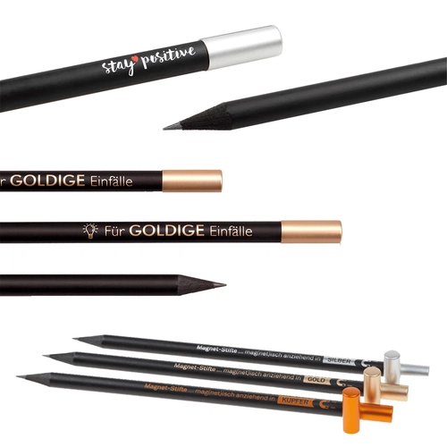 Une finition laquée noire ajoute une touche d'élégance à ce crayon, disponible avec un embout métallique en différentes finitions : argent, or, cuivre, bleu ou vert, permettant une personnalisation en harmonie avec votre marque ou vos préférences.