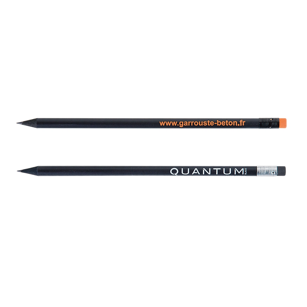 La forme de ce crayon est ronde mais existe en format Hexagonal ou carré. Nous vous proposons ce crayon publicitaire avec vernis noir teinté dans la masse. Il existe également avec vernis incolore ou sans vernis. Vous remarquerez également que le crayon a une tête avec gomme mais existe également avec tête pastillé ou tête coupée (sans gomme). Pour ce crayon avec gomme, vous avez le choix entre 15 couleurs de virole et 25 couleurs de gomme, vous permettant d'avoir un pantone approchant de votre logo d'entreprise.