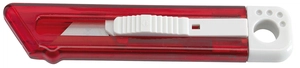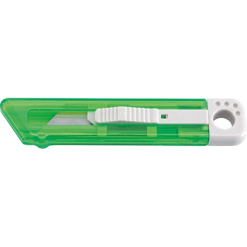 Cutter SLIDE IT : bouton poussoir avec ressort de rappel, lame interchangeable, coque plastique colorée avec oeillet pour accrocher.