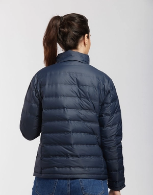 Le garnissage en duvet naturel offre une chaleur exceptionnelle sans alourdir la silhouette, tandis que la coupe féminine ajustée met en valeur la morphologie.