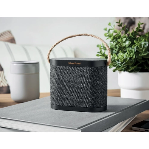 Équipée d’une poignée en jute naturelle, elle se transporte facilement. Sa batterie rechargeable Li-Ion 1200 mAh assure une autonomie d’environ 4 heures, avec une puissance de 5 W, 4 Ohm, 5 V.