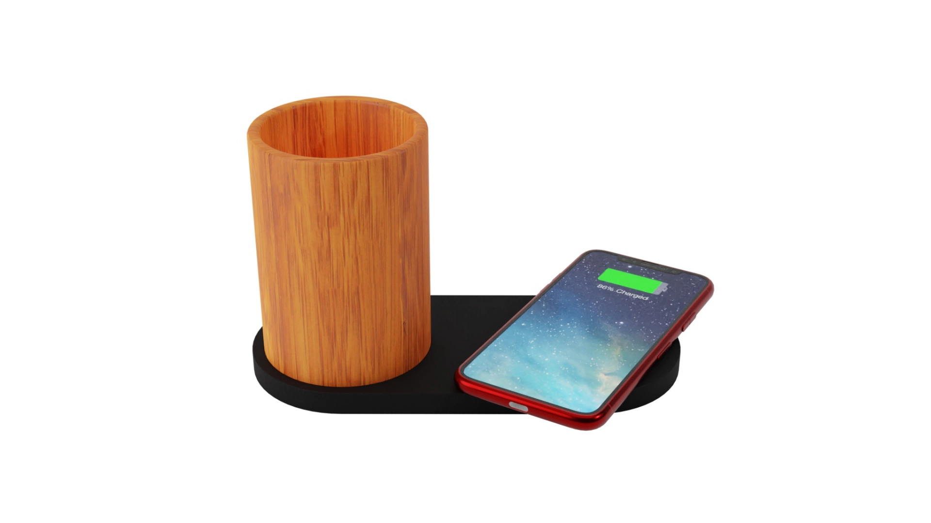 Pot à crayon rond en bois de bouleau FSC. Celui-ci est magnétiquement relié à la base en rubber ABS soft-touch dotée d'un chargeur à induction 10W. La base comporte également deux ports, un port USB type C et un USB-A lui permettant de charger jusqu'à 3 appareils en même temps.
