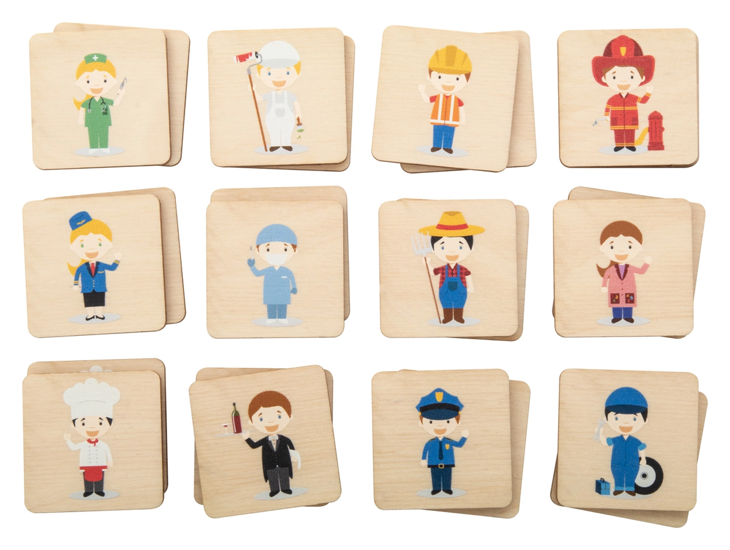 Jeu de memory en bois de bouleau laminé avec des motifs thématiques.