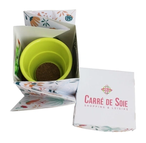 Ce cadeau publicitaire écoresponsable est parfait pour faire pousser fleurs, aromates ou légumes au fil des saisons, grâce à un roulement simple et pratique des semis. La grande surface de marquage sur la boîte en papier 350 g/m² permet de valoriser pleinement votre identité visuelle.