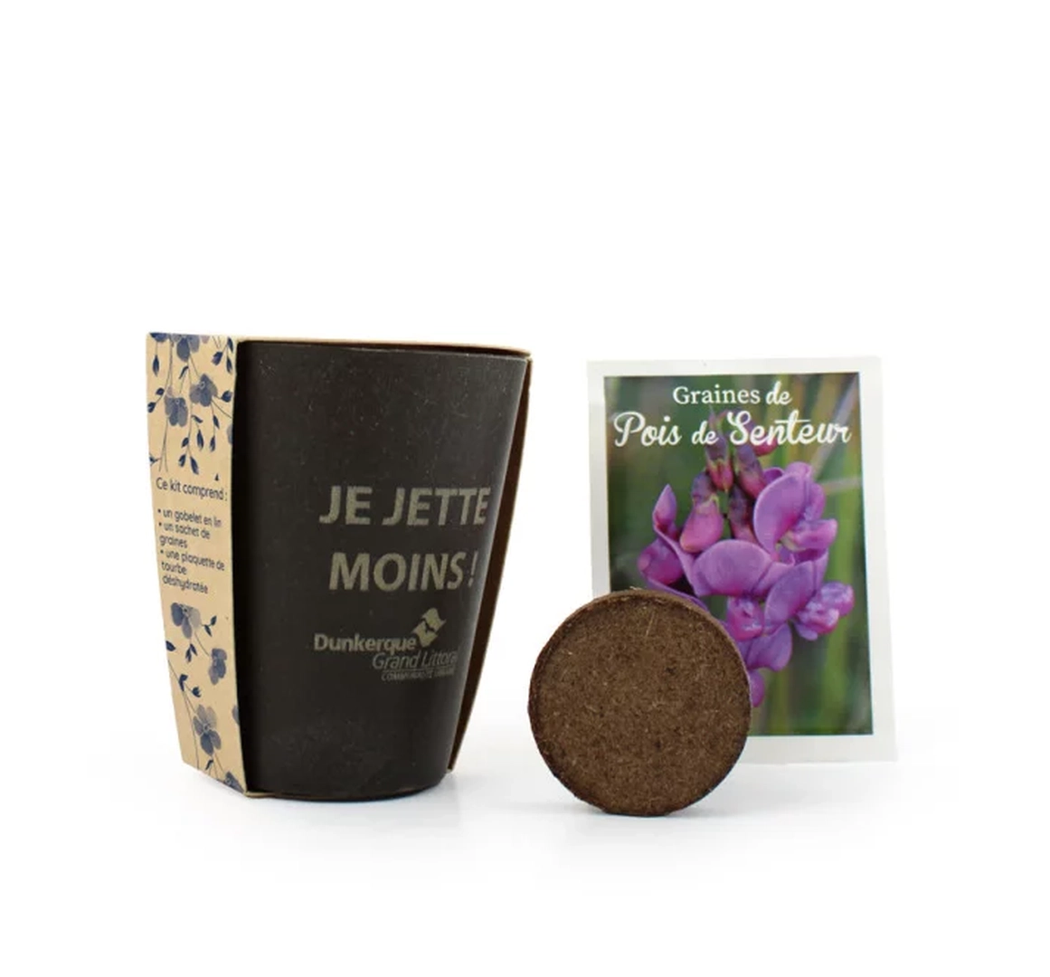 Ce kit végétal personnalisé permet de faire pousser des plantes variées (herbes, fleurs, etc.) tout en réutilisant le gobelet en lin au quotidien. Une manière intelligente d’associer écologie, praticité et communication de marque.