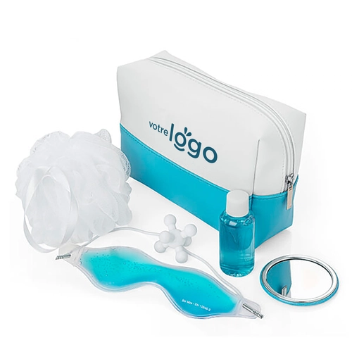 L'ensemble comprend un sac, une éponge pour le corps, un miroir, un masseur, un masque pour les yeux et un gel douche de 50 ml.