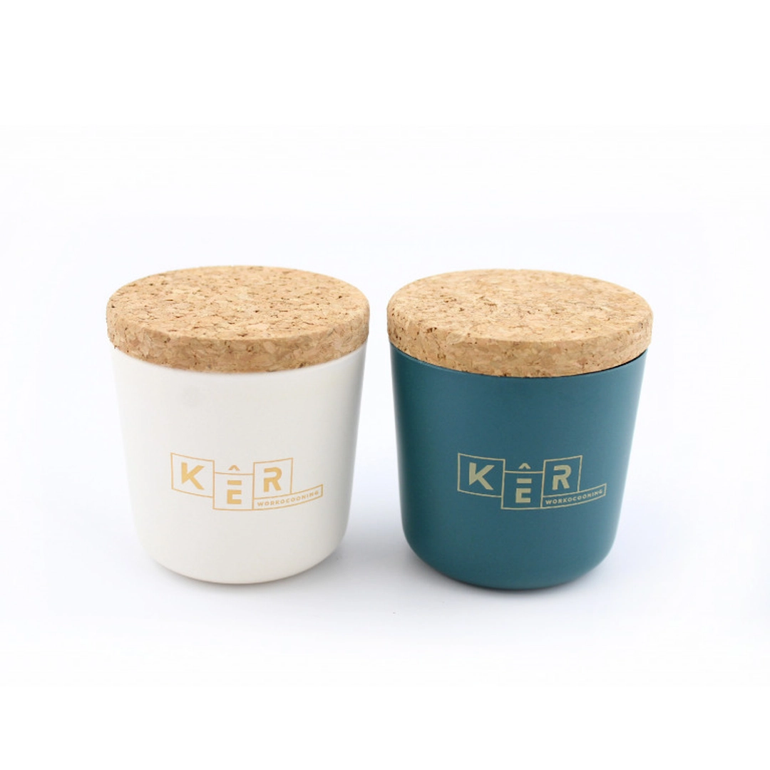 Petits bocaux en fibre de bambou certifiée FSC combinée avec une résine de mélamine 100% alimentaire, munis de bouchons de liège hermétiques.
