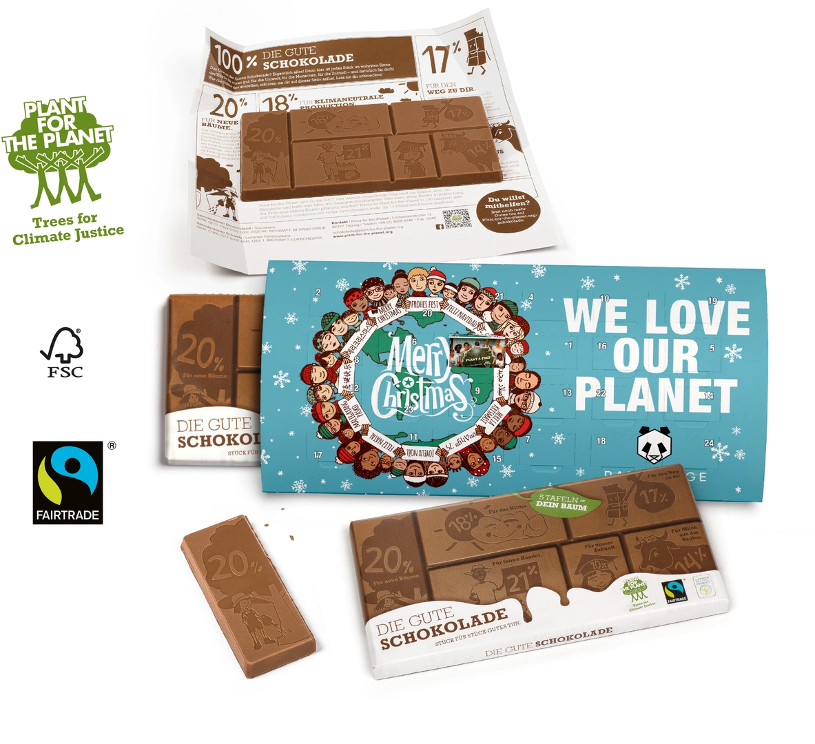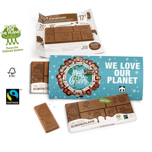 Tablette de chocolat au lait Suisse certifié commerce équitable, emballée dans un étui carton FSC avec 24 fenêtres personnalisables.