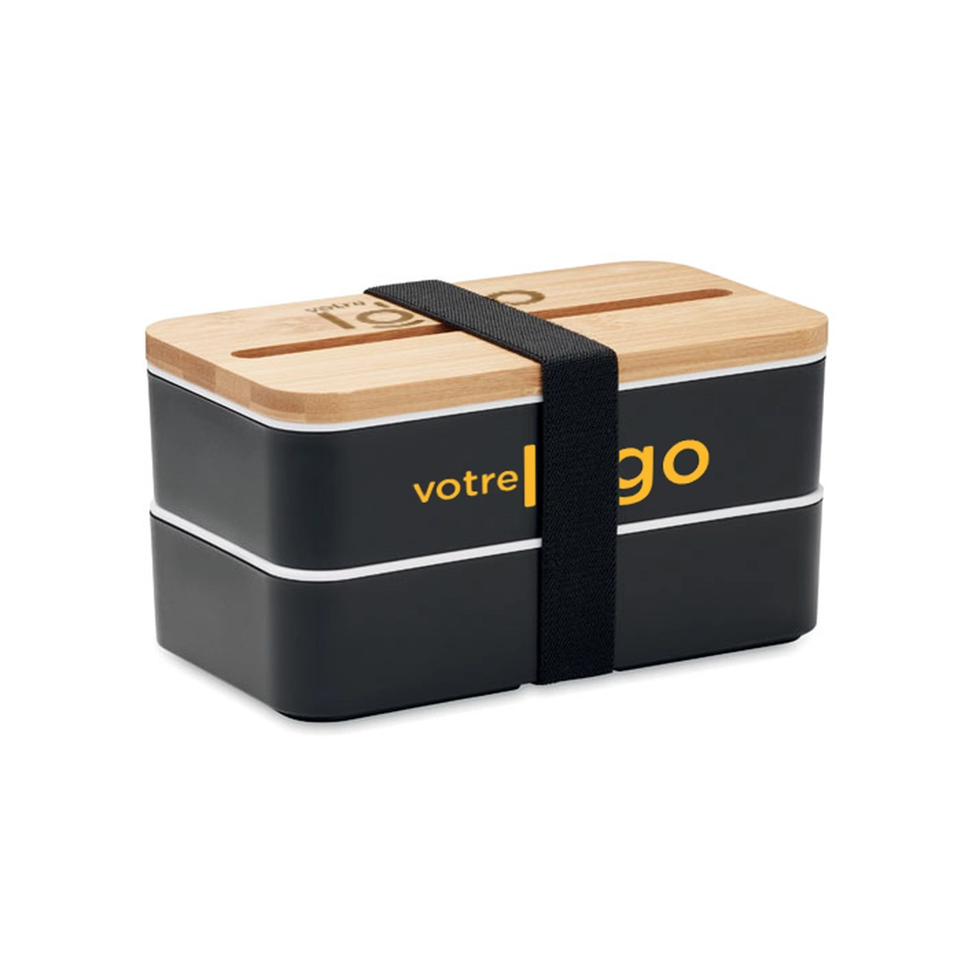 Lunchbox à deux niveaux en PP recyclé avec séparateur amovible et 3 couverts. Bande de fermeture en polyester et couvercle en bambou doté d'un support pour téléphone portable. Capacité : 400 ml (2x).