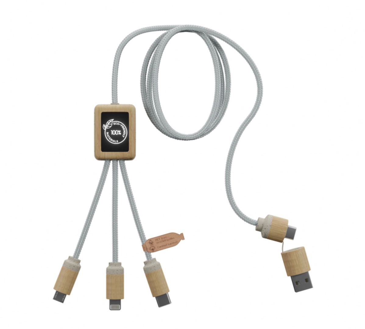 Découvrez notre Multicâble 5 en 1 à Charge Rapide, conçu pour répondre aux besoins de connectivité modernes tout en adhérant à des principes écologiques. Fabriqué à partir d'une combinaison innovante de matériaux respectueux de l'environnement, incluant des cordons en PET recyclé, bambou, fibres de blé et ABS recyclé, ce câble est un choix idéal pour les consommateurs et entreprises soucieux de leur impact écologique.