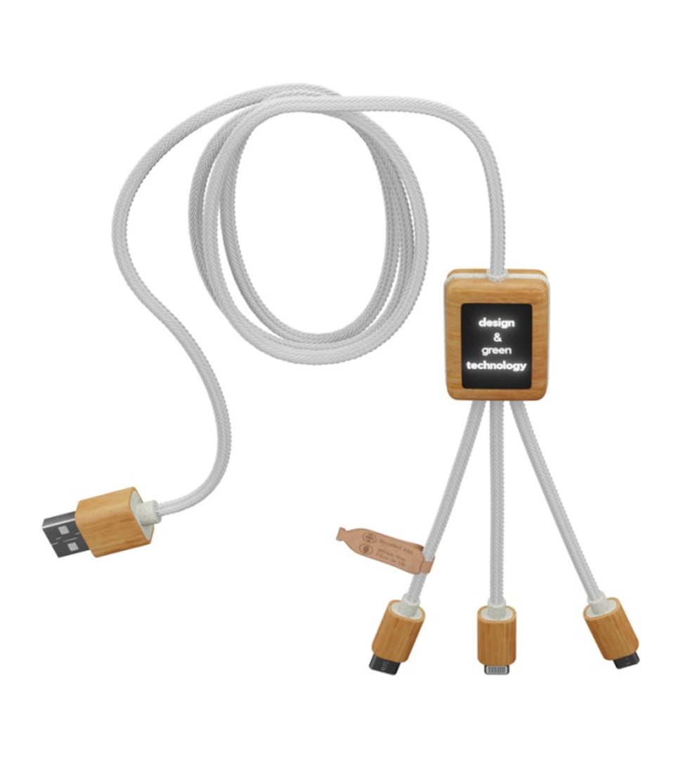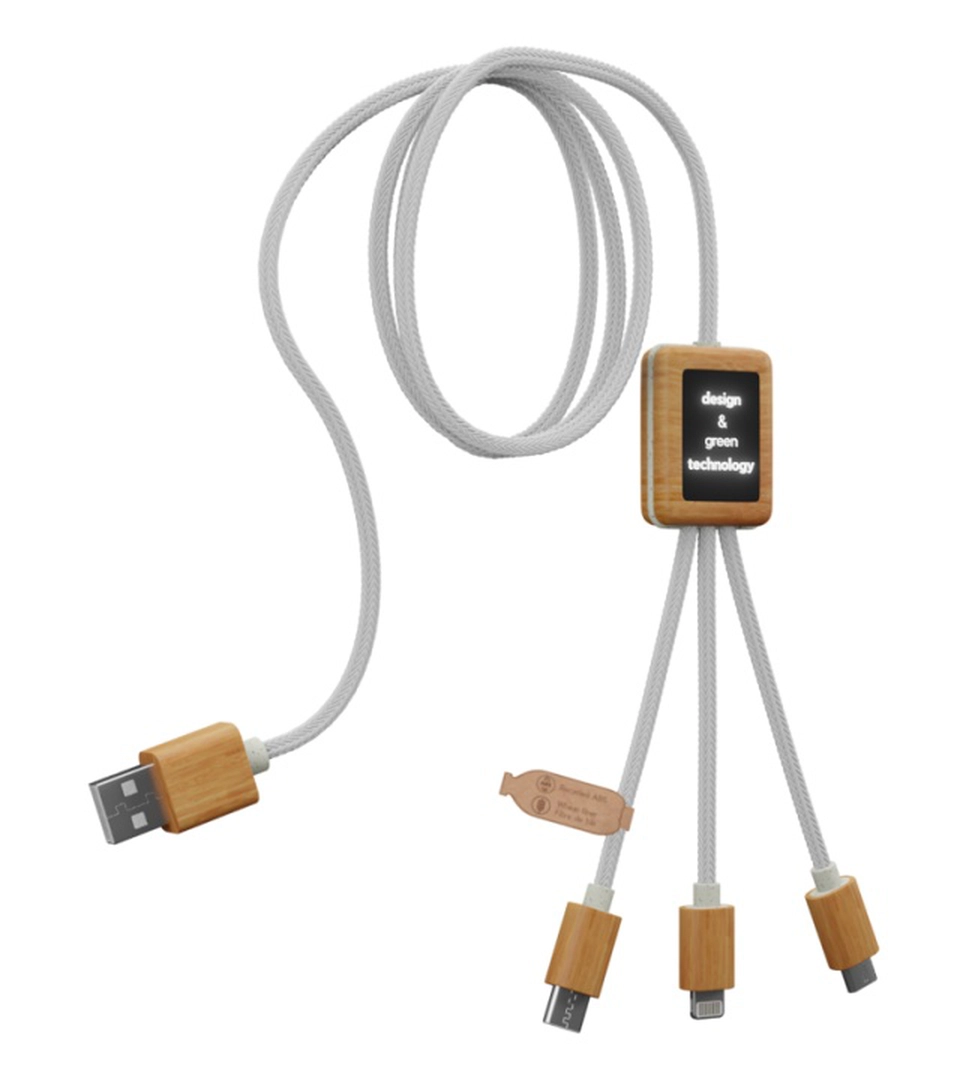 Introduisant notre solution de charge avancée : le Multicâble à Charge Rapide 2.4A Écoresponsable, personnalisable avec un double logo lumineux. Ce câble, conçu pour répondre aux besoins de connectivité modernes, est entièrement fabriqué à partir de matériaux respectueux de l'environnement, comprenant des cordons en PET recyclé, du bambou, des fibres de blé, et de l'ABS recyclé, soulignant notre engagement envers la durabilité.
