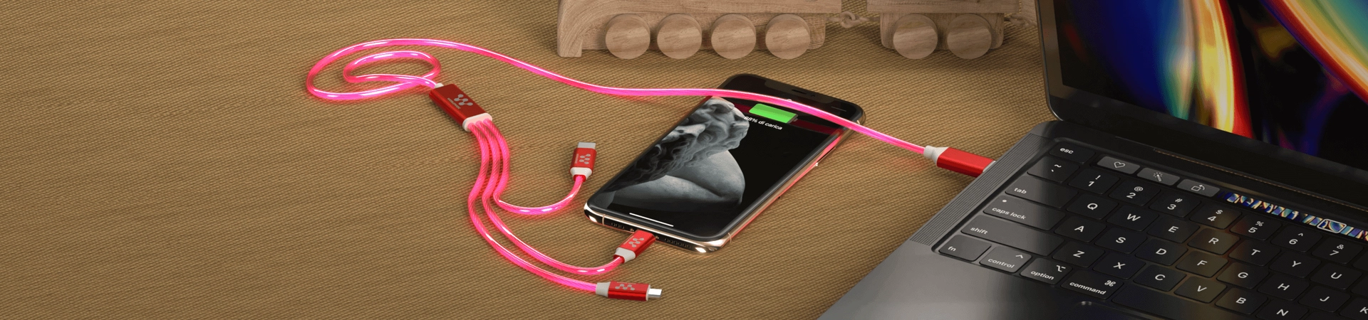 Ce qui rend ce multicâble particulièrement original est son émission de lumière LED intermittente pendant la charge, disponible en quatre couleurs dynamiques : rouge, bleu, vert, et bleu clair. Cette caractéristique ne manquera pas d'ajouter une touche de fun à votre expérience de recharge.