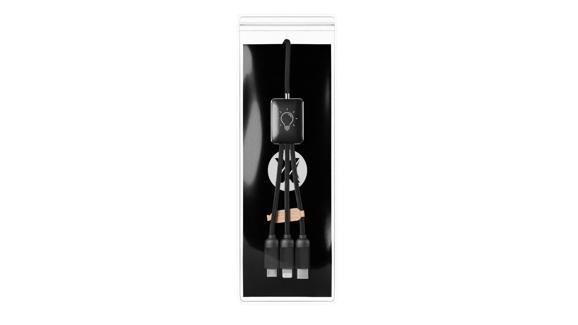 Câble d'un mètre avec double logo lumineux recto/verso pour type C, iPhone et Android et cordons en rPET (plastique issus de bouteilles recyclées).