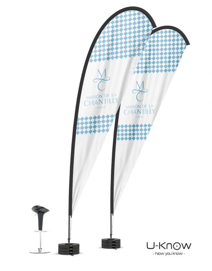 Beach flag goutte d'eau de 5m de hauteur. Voile oriflamme en matière 100% polyester 115g/m² de taille 372(h)x129(l)cm. Seule une impression recto seule est possible. L'impression est réalisée en quadri numérique et visible au verso par transparence. Le fourreau noir de la voile est renforcé et fabriqué dans un polyester Oxford 300 D. Le mât est en fibre de carbone (très résistant). Le mât se fixe sur le croisillon acier monté sur un axe de rotation spécial à roulement à billes MATP90. Il convient de lester avec au moins 2 socles PVC Béton sans axe de rotation pour obtenir une bonne résistance aux vents pour ces oriflammes géantes. Utilisation extérieure exclusivement. Garanti pour un vent inférieur à 70 km/h.