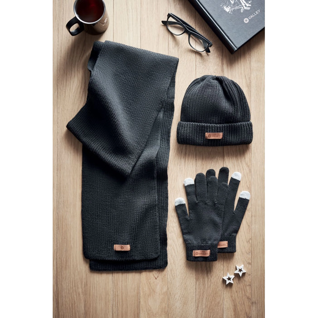 Ensemble d'hiver 3 pièces. Comprenant un bonnet en RPET, une écharpe et des gants tactiles avec une étiquette pour la zone d'impression. Taille adulte unique. Embrassez le froid de l'hiver avec ces accessoires assortis. Fabriqués en plastique PET recyclé, ces articles constituent un excellent choix durable. L'étiquette contrastée sur chaque article lui donne une touche de style.