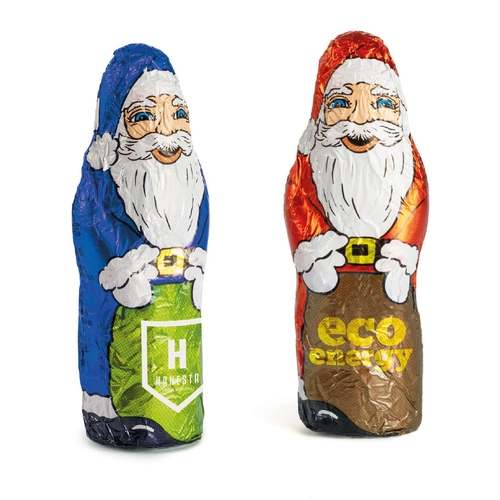 Père Noël au chocolat au lait emballé dans un papier argent personnalisable. La couleur et le logo sont eux aussi personnalisables.