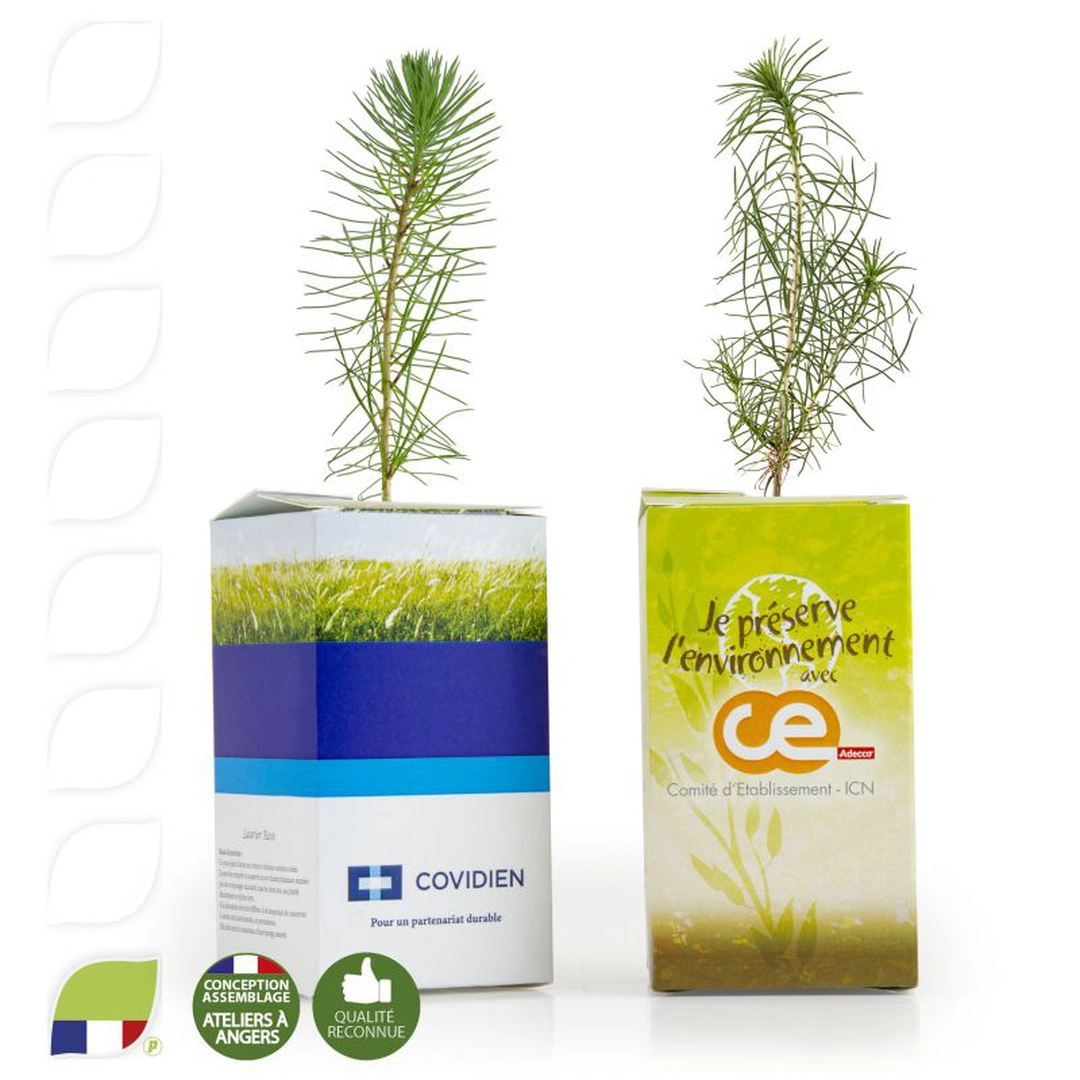 Plant de pin en cube carton imprimé. Cadeau green et personnalisé à offrir à vos prospects et clients pour une communication développement durable. Il s'agit d'un cadeau personnalisé à votre communication. Le pin reste le petit arbre le moins cher et le plus abordable de la gamme.