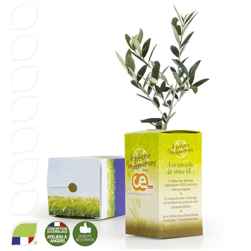 Plant d'olivier en cube carton imprimé. Cadeau Green et personnalisé à offrir à vos prospects et clients pour une communication développement durable. Il s'agit d'un cadeau personnalisé à votre communication.