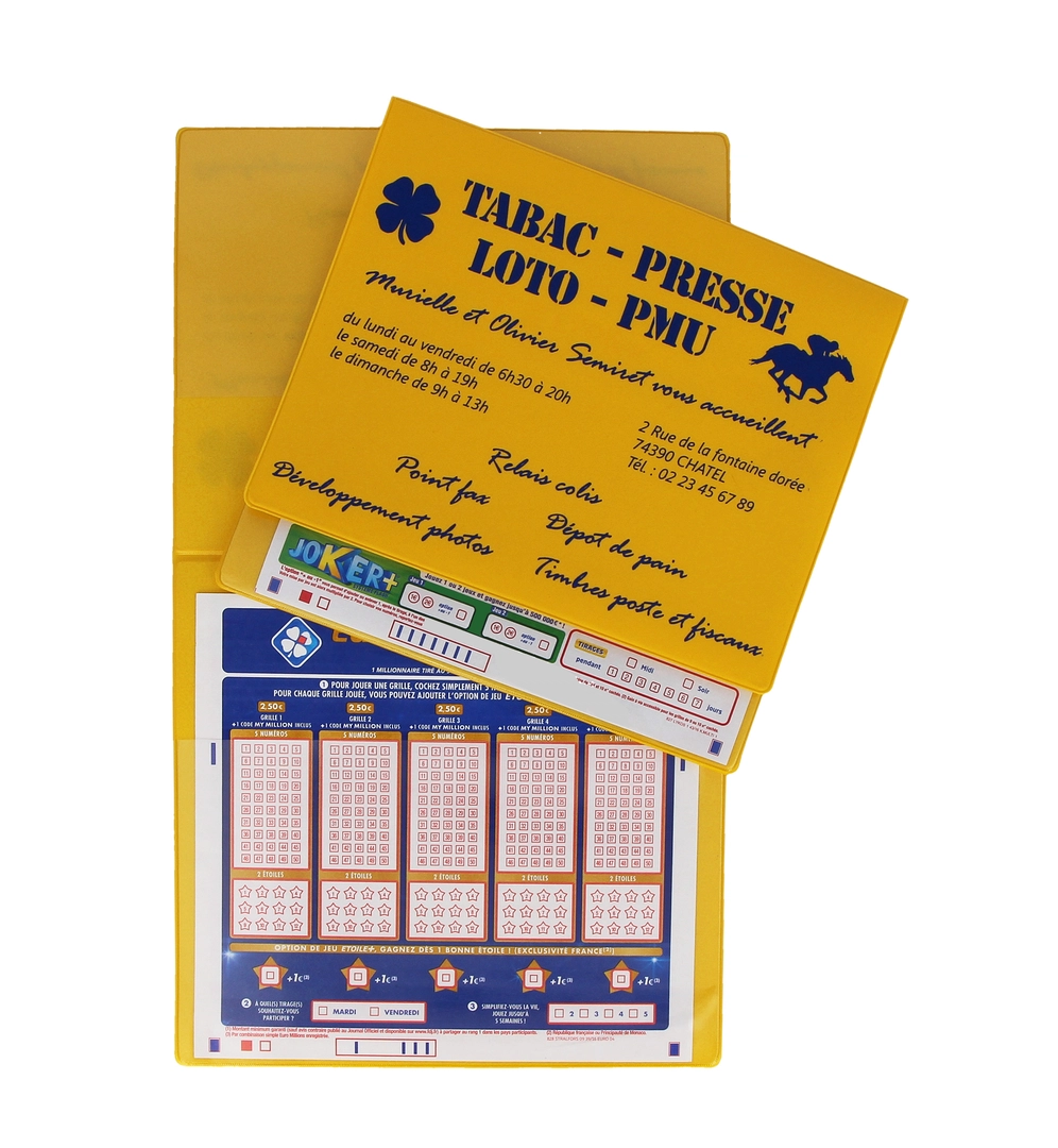 1 chance sur 19 millions, c’est la probabilité de remporter le gros lot en jouant au Loto (minimum 2 millions d’euros) ! Depuis 1976, plus de 16 000 personnes ont trouvé les 6 bons numéros, et près de 1000 joueurs sont devenus millionnaires ! De quoi donner espoir aux nombreux français amateurs de Loto ou autres jeux à gratter. Que vous soyez buraliste, responsable d’un tabac-presse ou d’un établissement PMU, misez sur un objet publicitaire original pour promouvoir votre commerce. Cette petite pochette, dotée de deux emplacements en cristal, permet à vos clients de ranger leurs jeux à gratter ou tirages et éviter de les égarer. Elle leur permet également de séparer les tickets gagnants, des tickets neufs, afin de mieux organiser leur jeu.