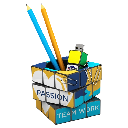 Le pot à crayons est l'accessoire idéal pour associer les valeurs du Rubik's (iconique, créatif, intelligent) à votre marque/message.