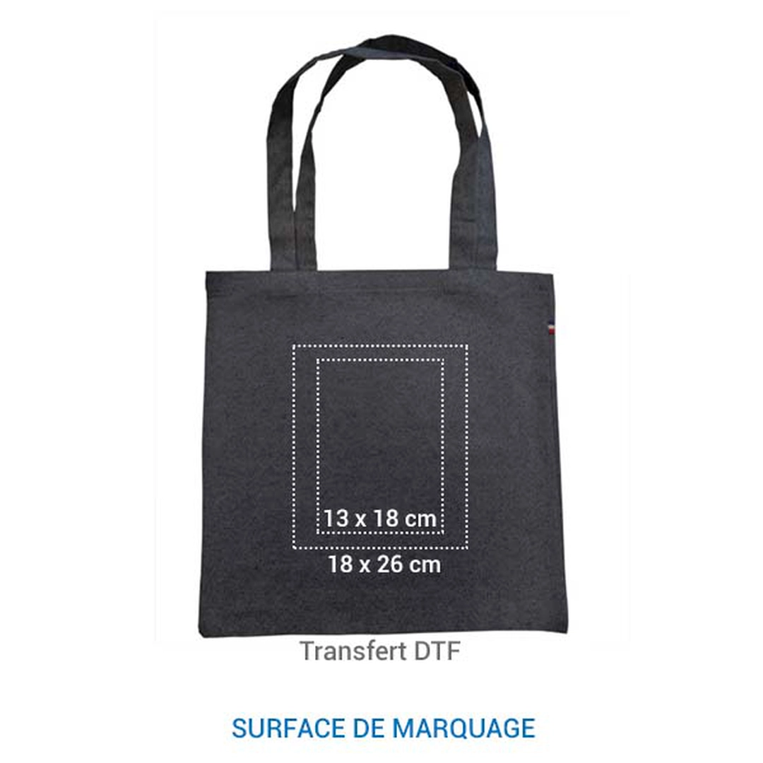 Doté d'anses longues de 65 cm pour un porté épaule confortable et d'une large surface de marquage, ce sac personnalisable est l'outil idéal pour une visibilité durable de votre logo ou message. L'étiquette française cousue à l'extérieur ajoute une touche d'authenticité et de qualité.