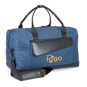 Ce sac de voyage publicitaire est disponible en deux coloris : bleu ou gris. Pour ce qui est de la personnalisation, plusieurs options s’offrent à vous. Vous pouvez avoir un sac de voyage personnalisé par sérigraphie ou par gravure laser. Vous pouvez personnaliser le rabat en cuir de la poche avant et la poche, directement sur le tissu.