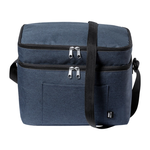 Sac isotherme en polyester RPET 600D doublé en PEVA, avec 2 compartiments zippés et bandoulière réglable. Labélisé RPET.