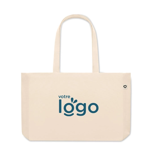 Sac shopping ou sac de plage en toile recyclée 280 gr/m². Ce sac fourre-tout est doté de longues poignées qui permettent de le porter à la main ou sur l'épaule pour garder les mains libres. La base à soufflet le rend très utile pour emporter beaucoup d'articles à la plage ou lors de vos courses à l'épicerie. Le sac est fabriqué à partir de 50% de coton et 50% de coton recyclé.