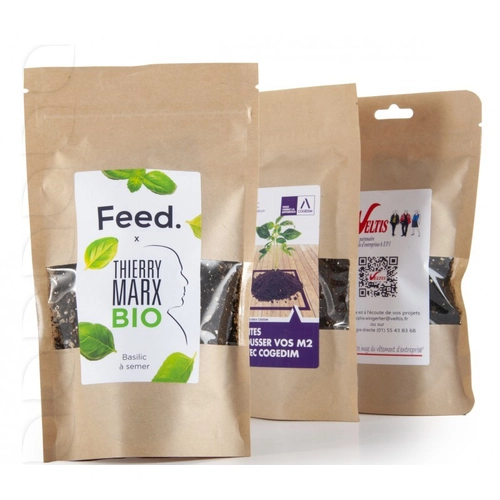 Le Sachet personnalisé garni de terre et graines - kit de plantation est personnalisable en impression quadri à votre communication sur 2 stickers sur les 2 côtés du sachet. Sticker face avant et face arrière.