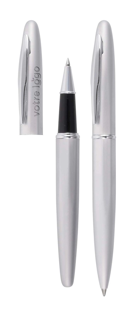 Set d'écriture COMTESSE : comprend un roller en métal avec capuchon (encre noire) et un stylo en métal (encre bleu), avec décorations chromées et brillantes, Livré dans une boîte cadeau.