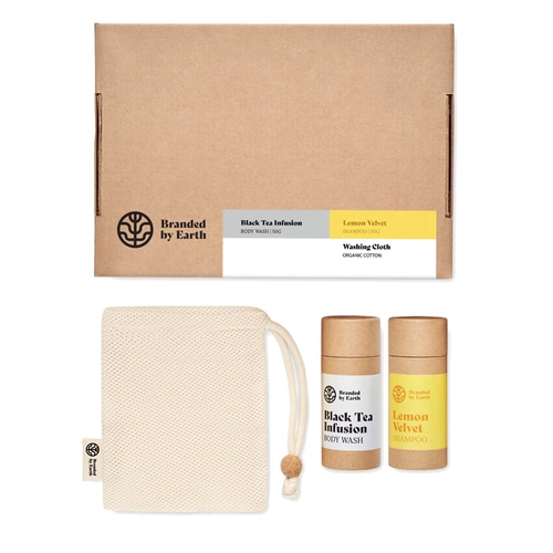 Set de voyage comprenant gel douche, shampoing et gant en coton bio