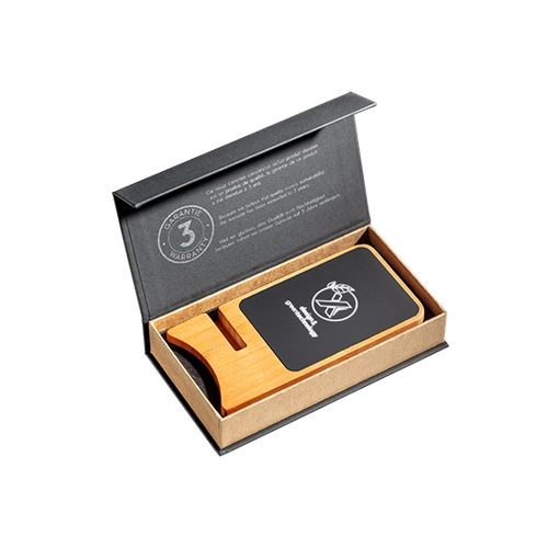 Support à chargement induction 10W compatible QI en bois certifié FSC avec rubber antibactérien et logo lumineux.
