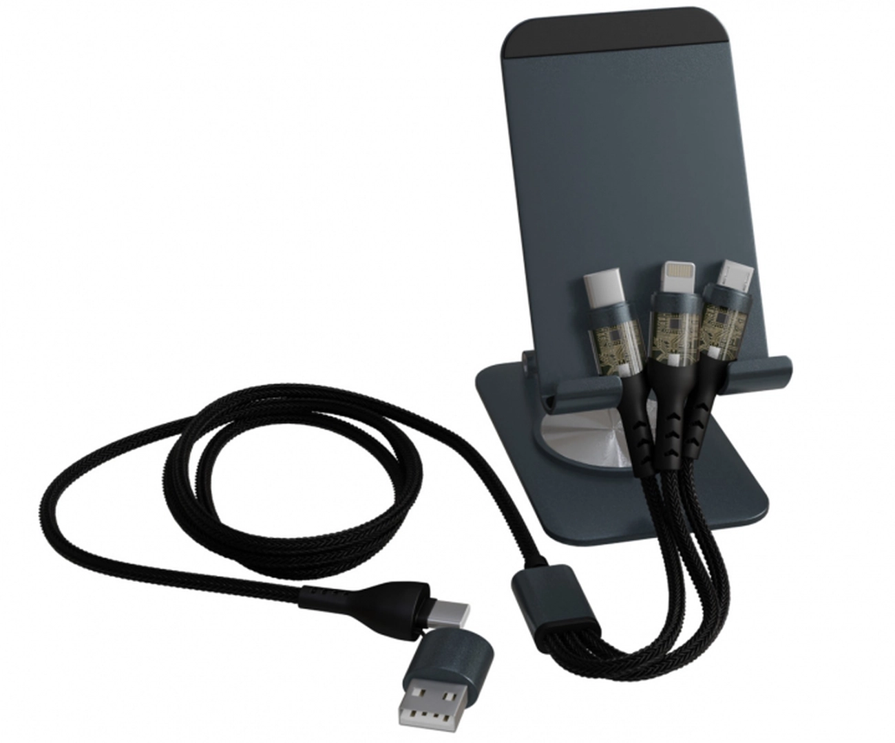 Explorez notre support de téléphone en métal innovant, offrant une flexibilité totale avec une rotation à 360°, accompagné d'un multicâble de charge rapide 5-en-1 pour une efficacité maximale. Ce câble polyvalent comprend deux sorties (Type-C/USB) et supporte une charge rapide impressionnante de 60W & 3A, équipé d'embouts transparents qui s'illuminent pour indiquer l'activation de la charge. Conçu dans une finition élégante de couleur gris sidéral, ce support et son câble permettent jusqu'à trois chargements simultanés, offrant une solution de charge complète pour tous vos appareils.