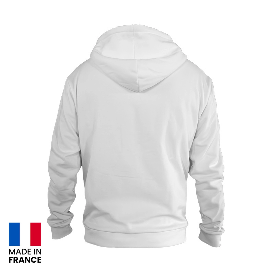 Ce sweat à capuche se distingue par sa finition soignée, avec une bande de propreté, des bords côtes aux manches et au bas pour une coupe ajustée et moderne. La capuche, doublée et pourvue d'un cordon de serrage, garantit un ajustement parfait, tandis que le galon tricolore souligne notre engagement pour le design et la qualité française. La fermeture éclair intégrale offre une praticité sans pareil, et l'intérieur molletonné promet chaleur et douceur lors des journées plus fraîches.