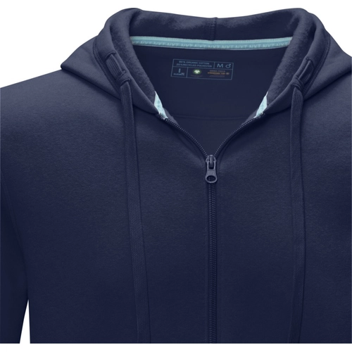 Vêtements promotionnels durables. Fermeture à glissière à spirale certifiée GRS au centre. Cordon de serrage certifié GOTS dans la capuche. Poche kangourou. Brossé à l'intérieur. Poignets côtelés plats. Ourlet du bas en tricot plat. Bande de propreté bicolore. Demi Lune. Étiquette principale en transfert pour un meilleur confort.