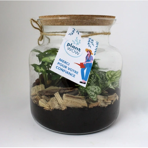 Ce terrarium en verre (Ø 190 mm x H 200 mm) est fermé par un couvercle en liège naturel (Ø 148 mm) personnalisable par gravure laser. À l’intérieur, trois plantes décoratives — Syngonium, Asparagus et Hypoestes — cohabitent dans un écosystème stable composé de terreau, copeaux de bois, roche volcanique et billes d’argile.