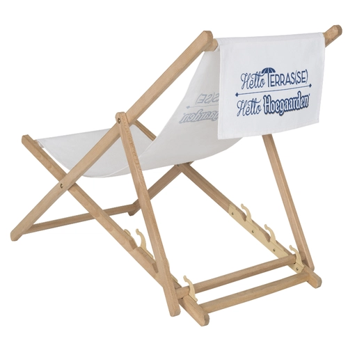 Nos transats se distinguent par leur châssis en bois de hêtre naturel, sélectionné pour sa robustesse et son esthétique raffinée. La toile amovible en polyester offre non seulement un confort optimal mais permet également une personnalisation à 100 %, offrant ainsi une toile vierge pour votre créativité publicitaire.